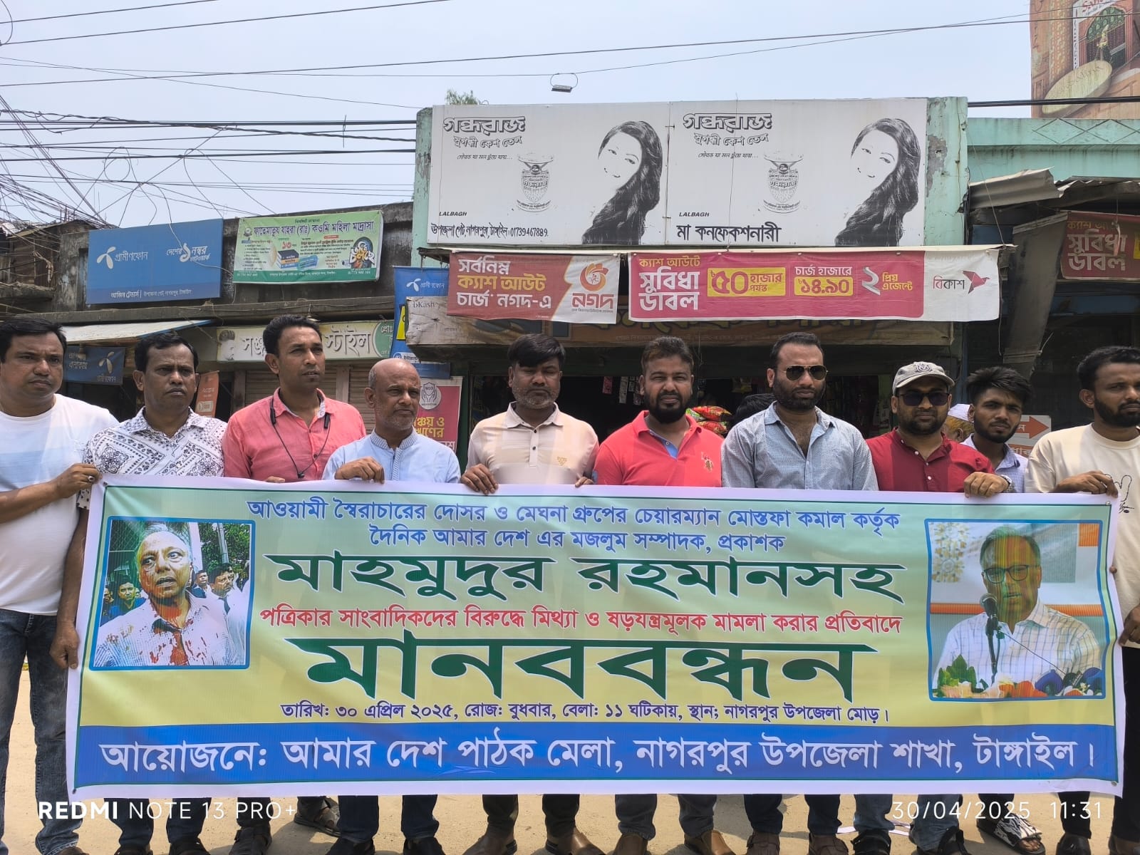 ফ্যাসিবাদী শাসনের ধারাবাহিকতায় বারবার নির্যাতনের শিকার হওয়া জনপ্রিয় দৈনিক আমার দেশ পত্রিকার সম্পাদক ড. মাহমুদুর রহমানের বিরুদ্ধে দায়েরকৃত মামলার প্রতিবাদে টাঙ্গাইলের নাগরপুরে মানববন্ধন অনুষ্ঠিত হয়েছে।